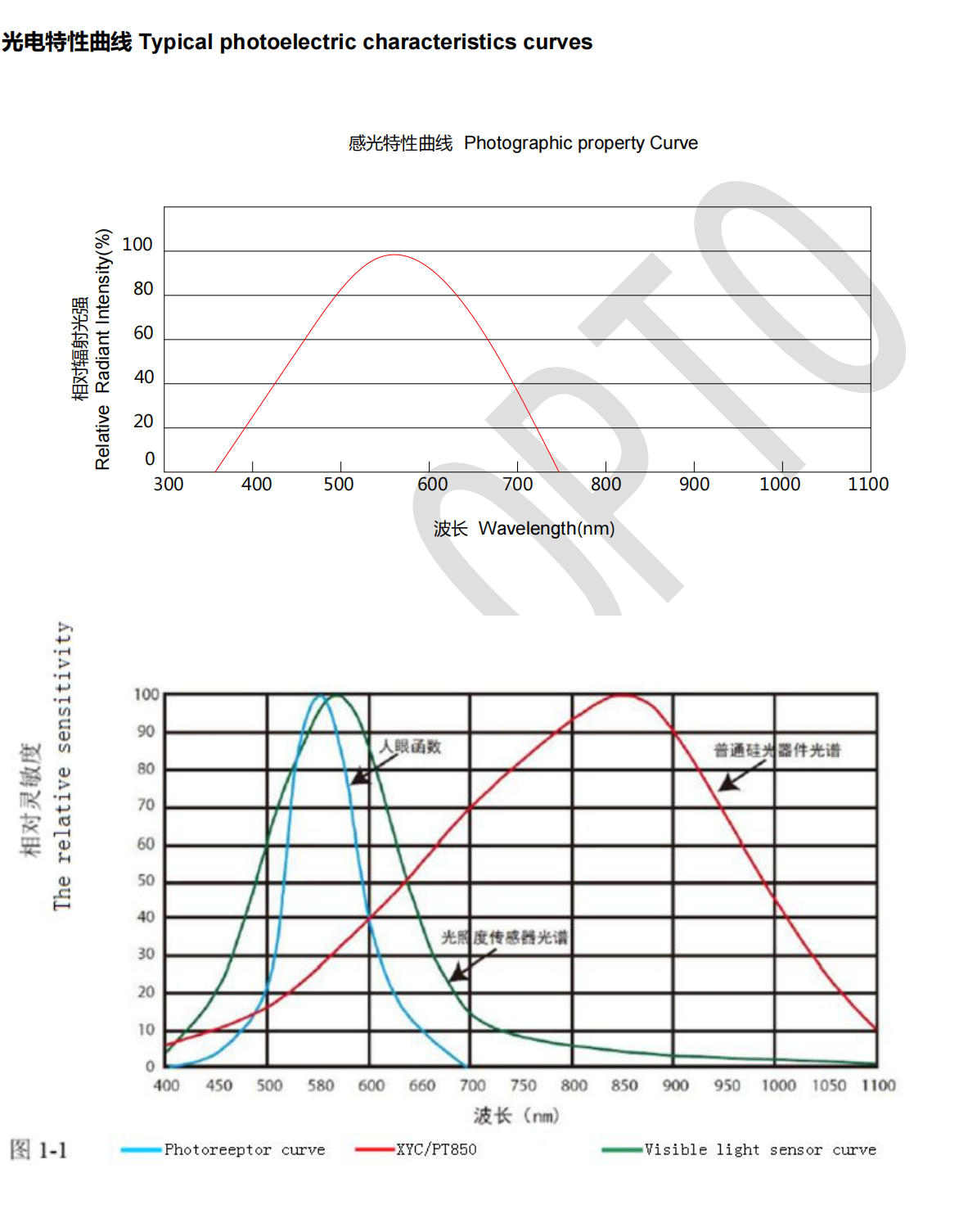 1) 感光峰值波長 550nm Photosensitive peak wavelength λp=550nm
